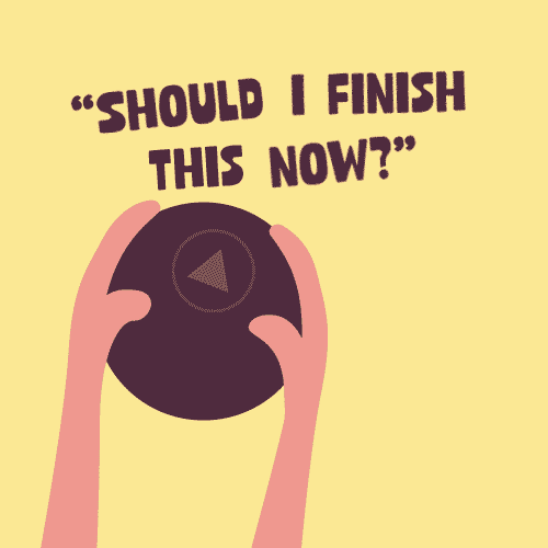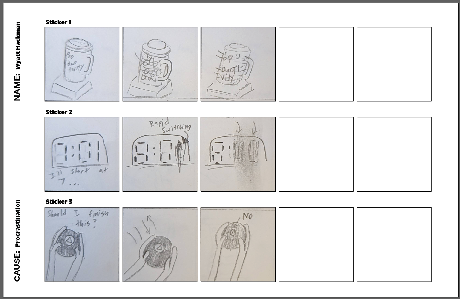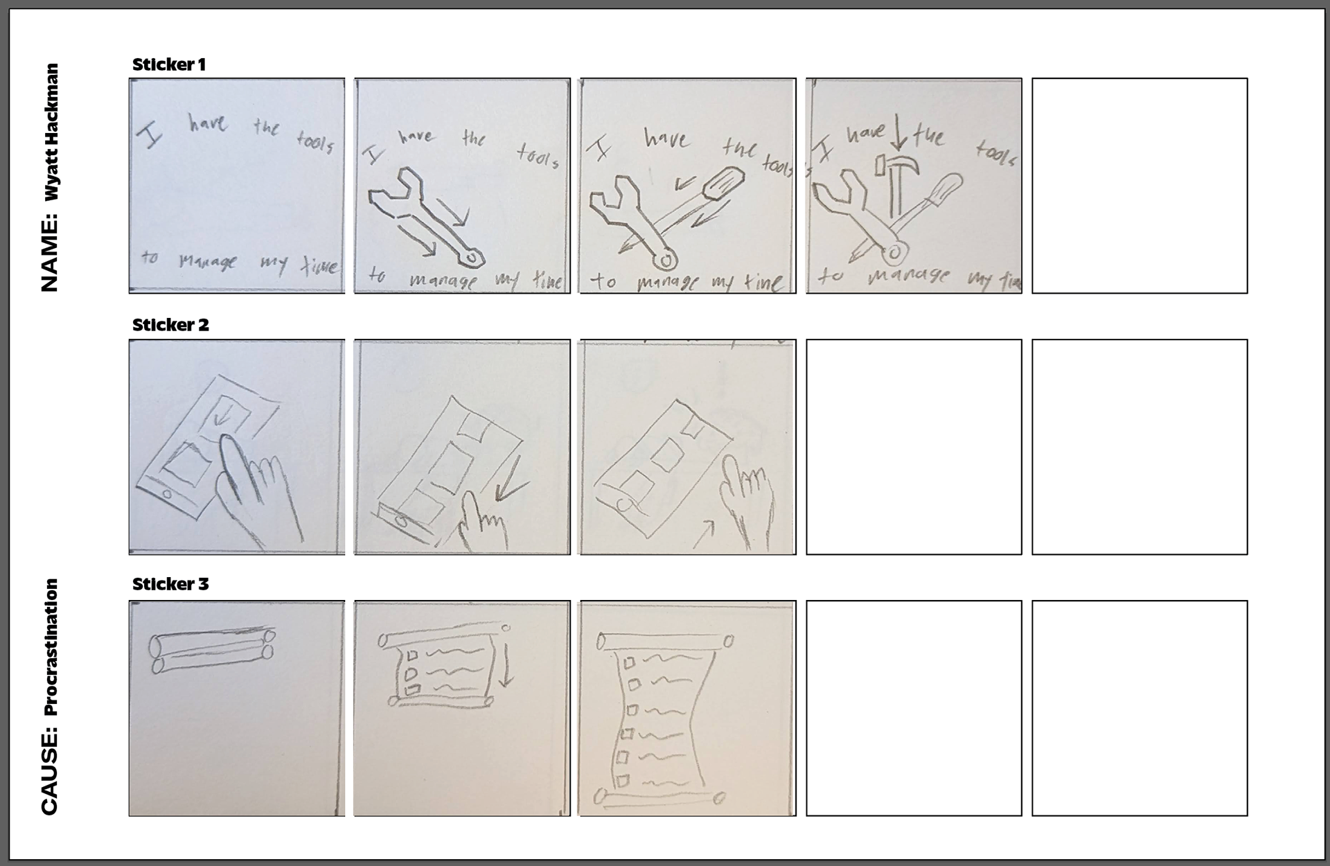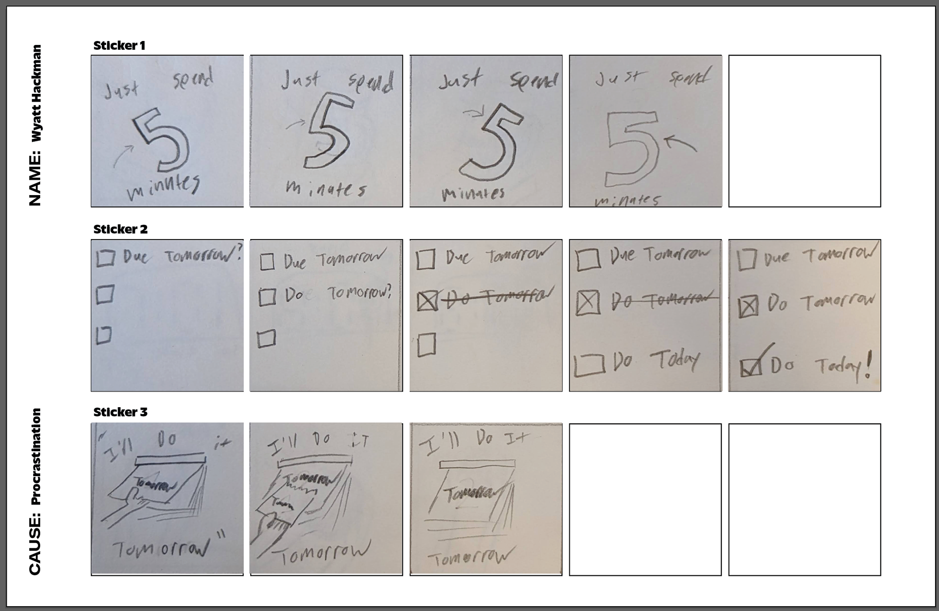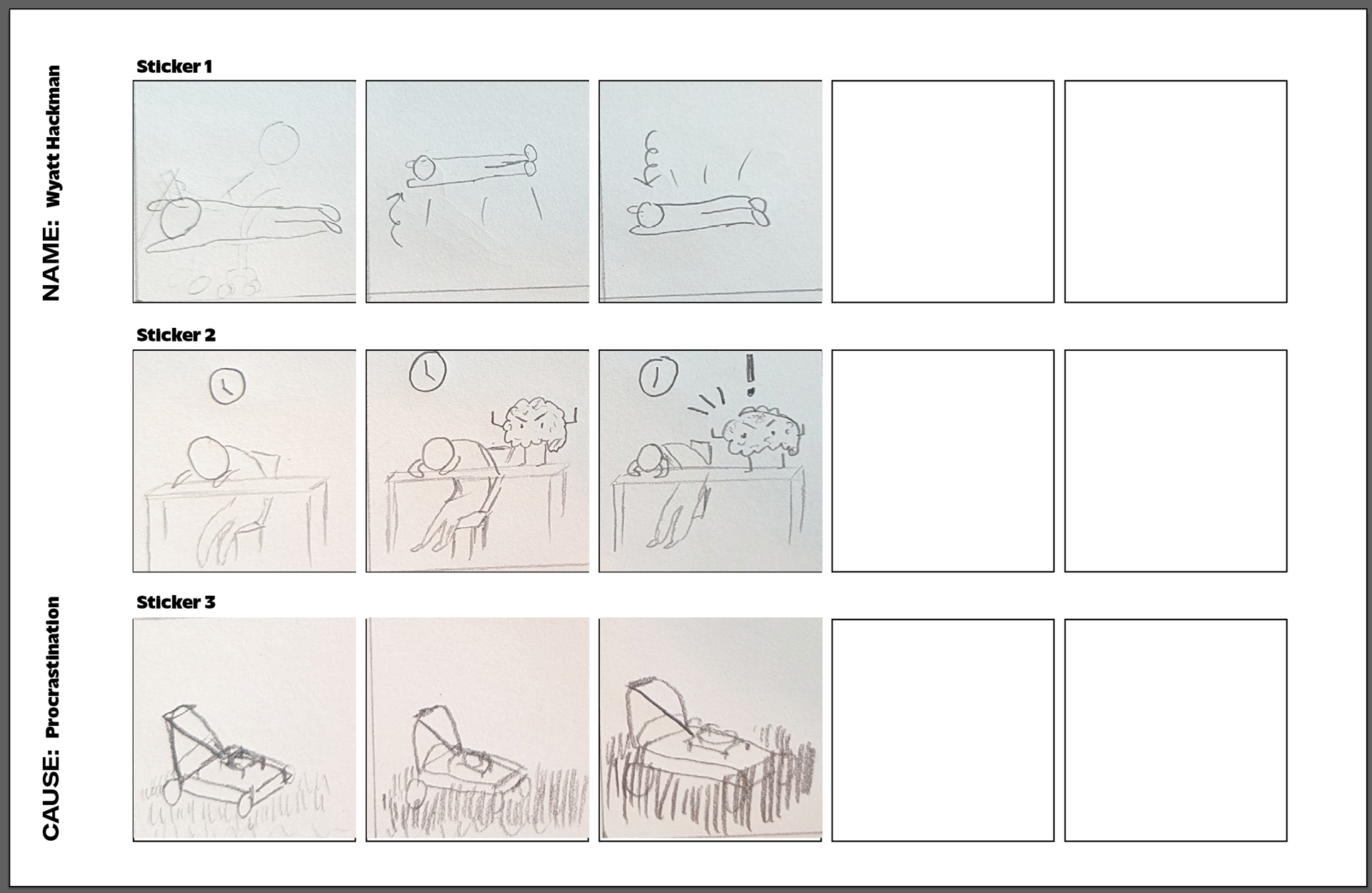 I took three different approaches to the overall visual designs of my stickers. Every sticker is either something that someone may do instead of procrastination depicted in a sort of negative (albeit lighthearted way), a sort of positive encouragement to help motivate, or a task not getting completed with some sort of representation of time passing.