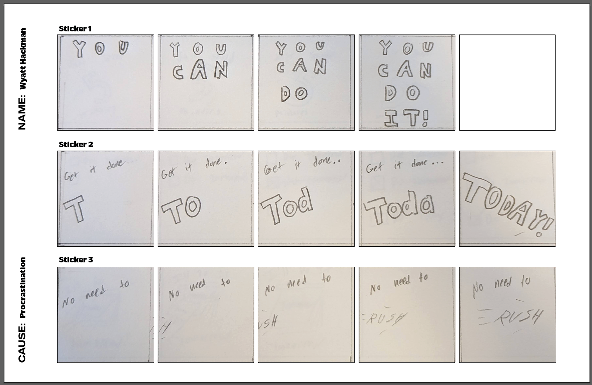 I was tasked with creating a set of 15 animated stickers in order to represent and comment on a cause of some kind. I decided to base my stickers around the idea of procrastination as while it isn't a conventional cause it still is a problem that many people deal with and may find relatable.
