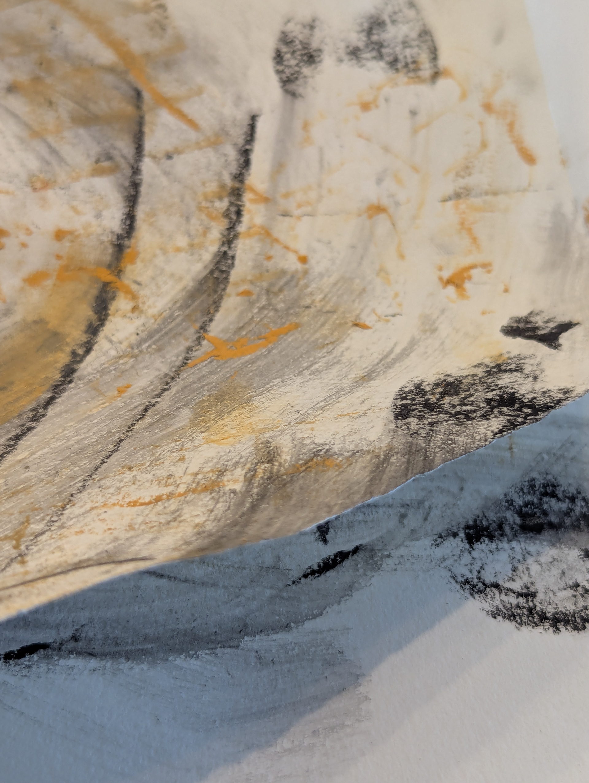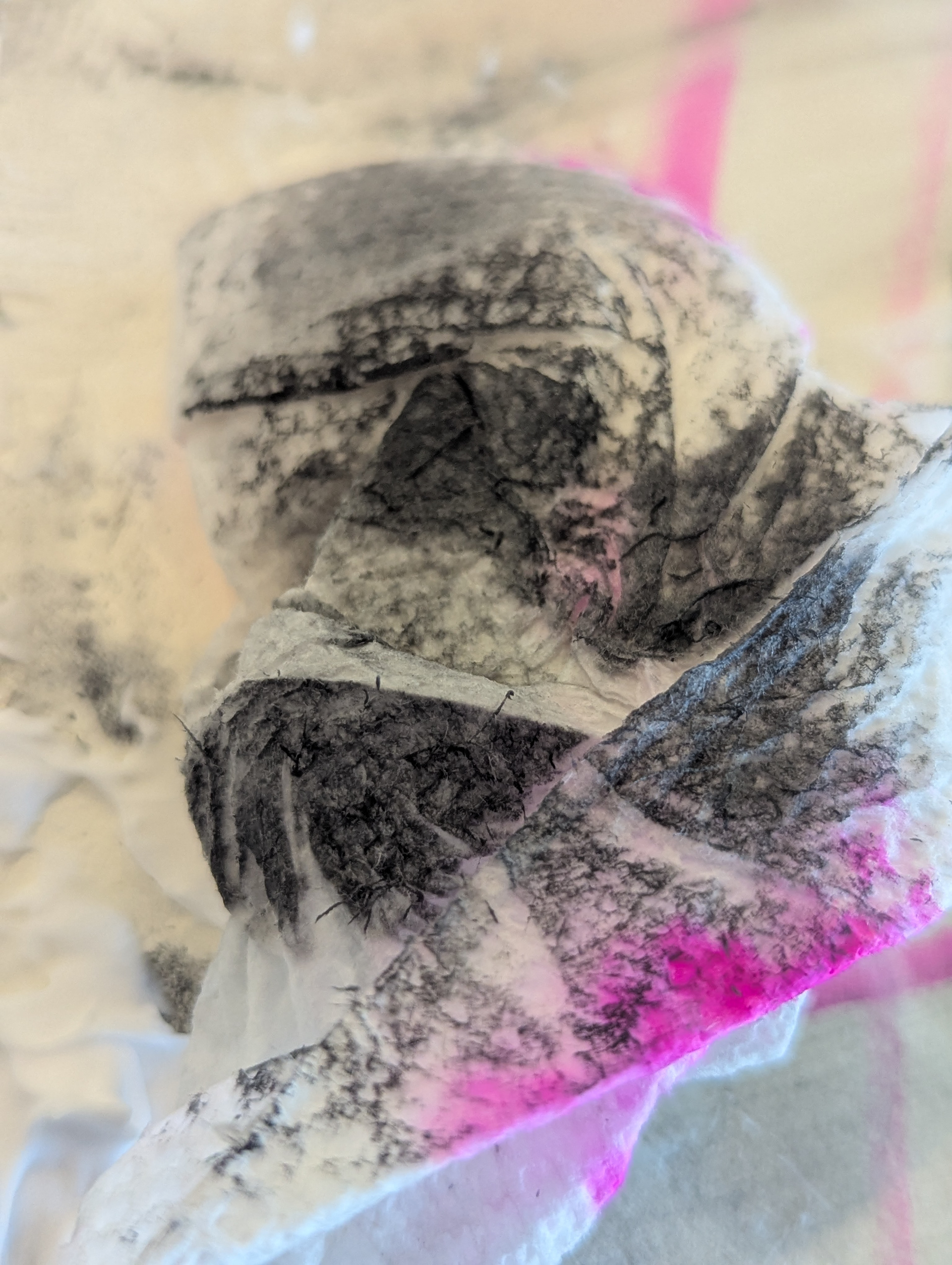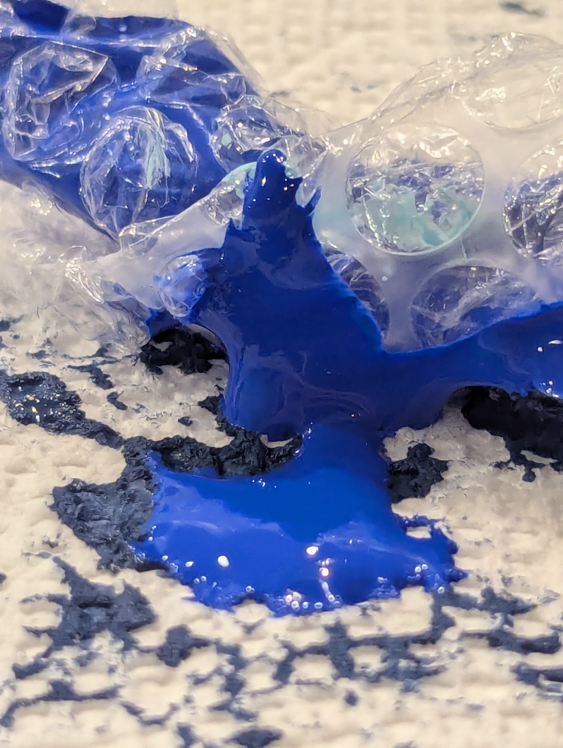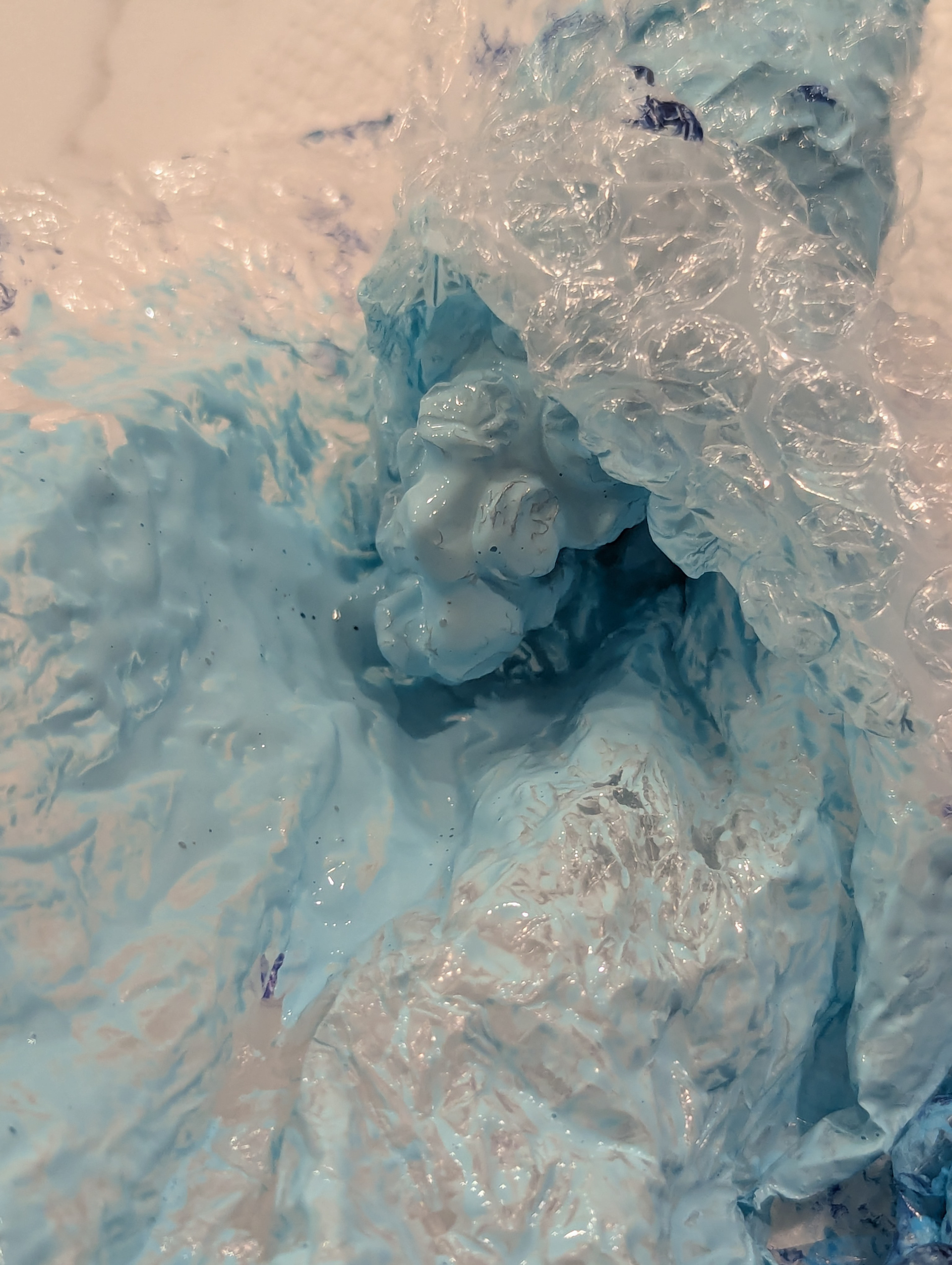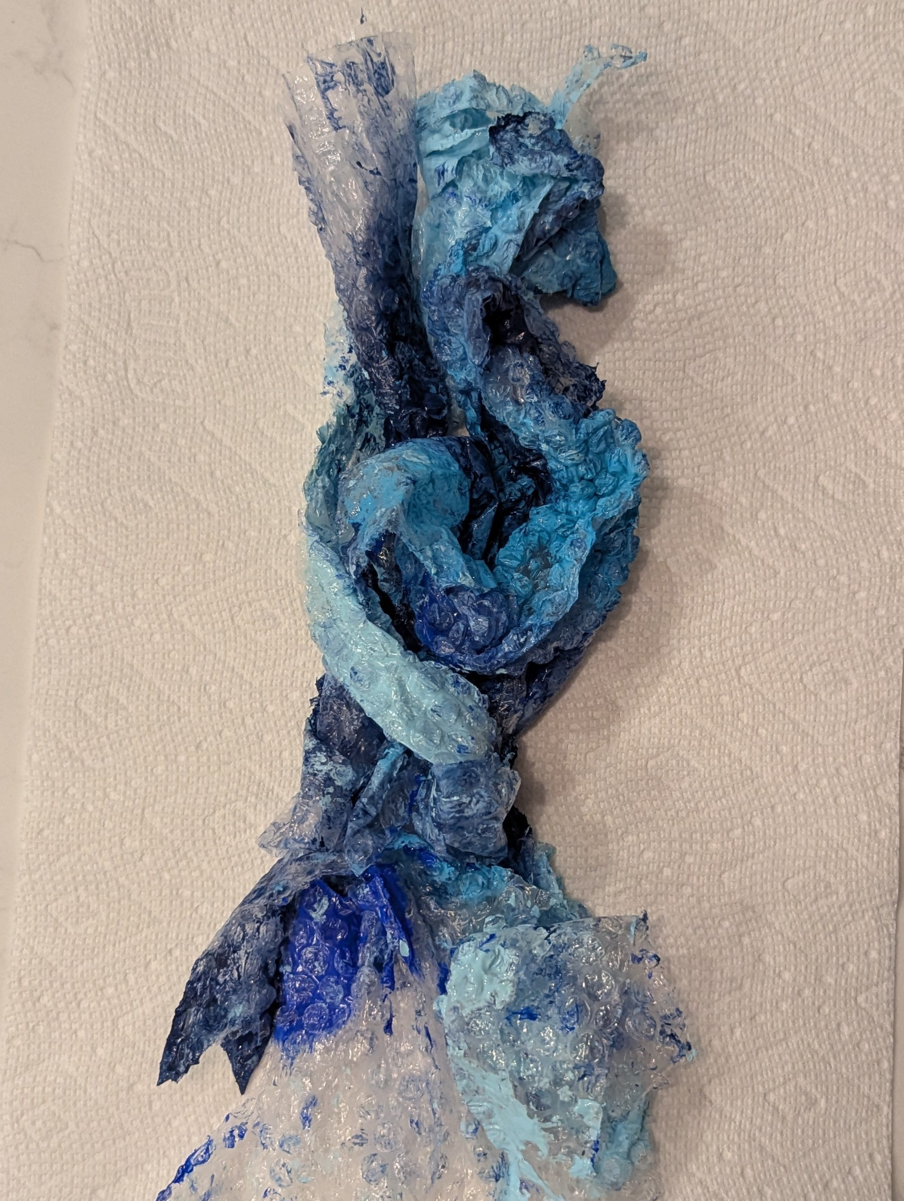 I felt this was my most successful study due to the unique and interesting forms that I was able to create. I initially had a bit of trouble trying to come up with an interesting way to approach this pairing, as early on, I noticed that it was a bit difficult to emphasize a sort of twisting motion on a single piece of bubble wrap. I tried twisting several together, which provided a bit better results; however, the bubble wrap twists were still a bit muddled together. It wasn’t until I tried adding acrylic paint that it began to come together. I utilized several different blues to create a sort of gradient within the forms and help create a bit of separation between the pieces of bubble wrap. The use of acrylic paint also helps accentuate the actual bubbles on the bubble wrap.