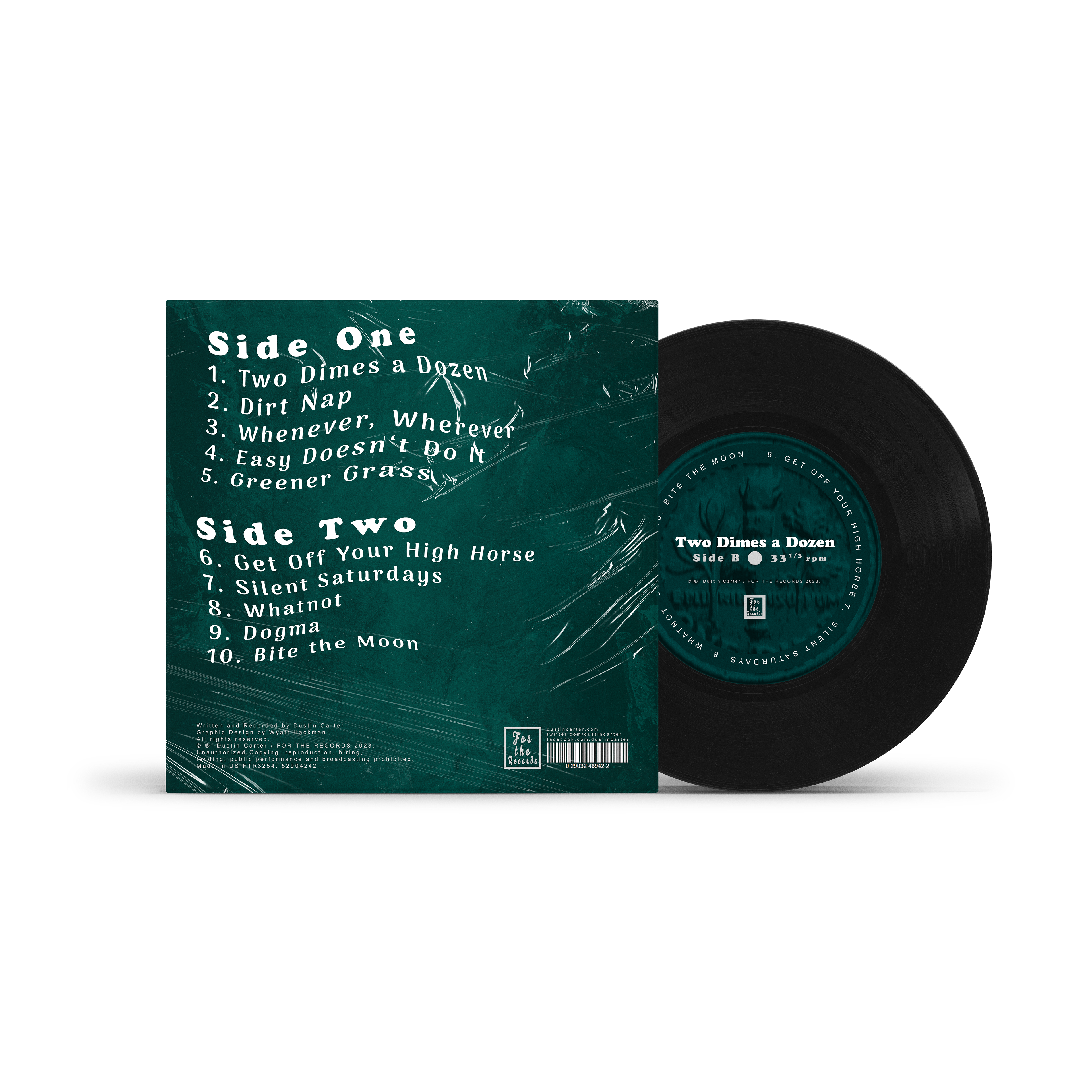 While the front cover remained nearly identical besides a couple of changes, the design of the back of the vinyl underwent many changes in order to find a layout that was both easily readable and fit with the overall style of the album. Which I ultimately achieved by liquefying the text in a left aligned paragraph format.